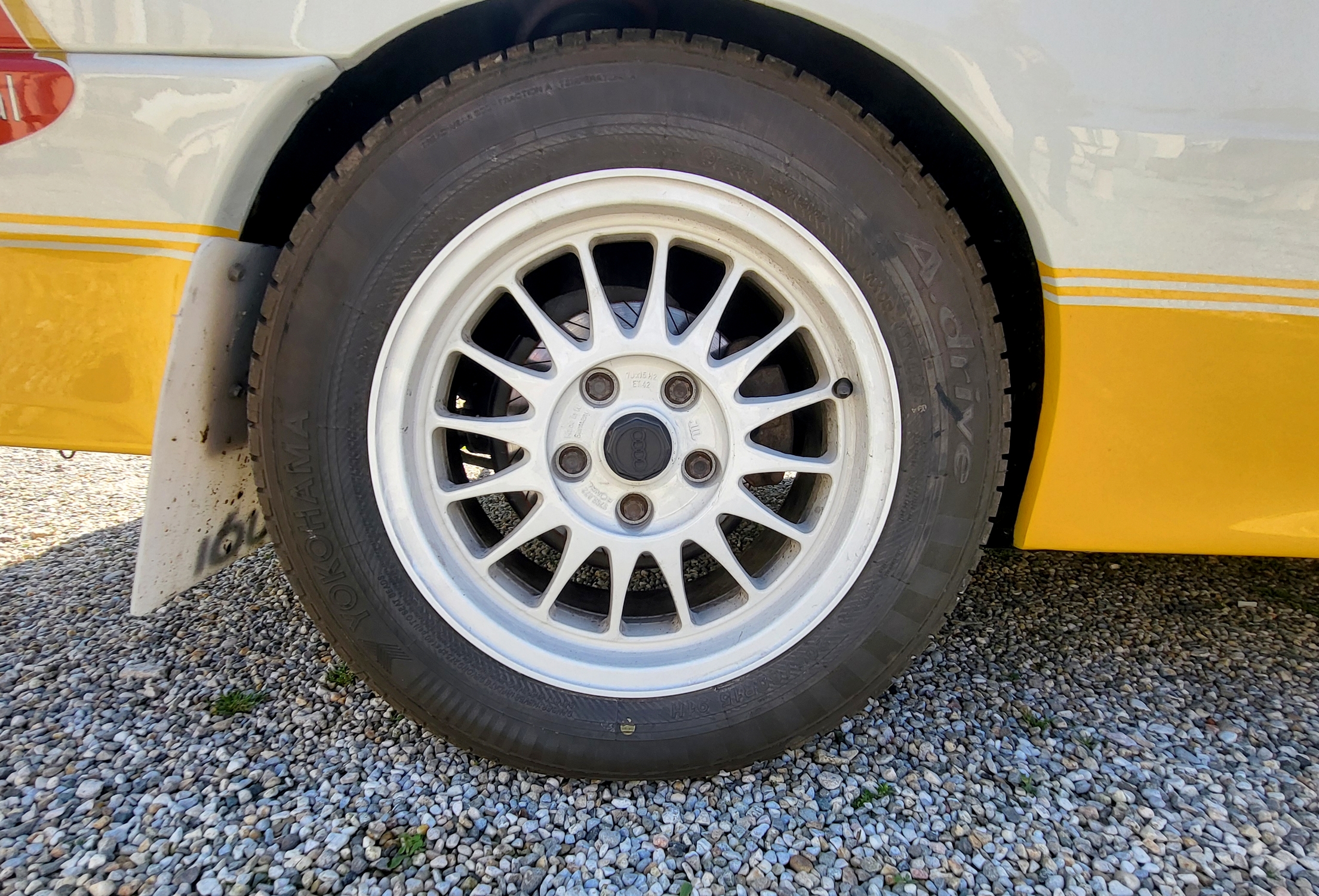La voiture repose sur ses jantes d'origine chaussées de pneumatiques Yokohama en 205/60R15.