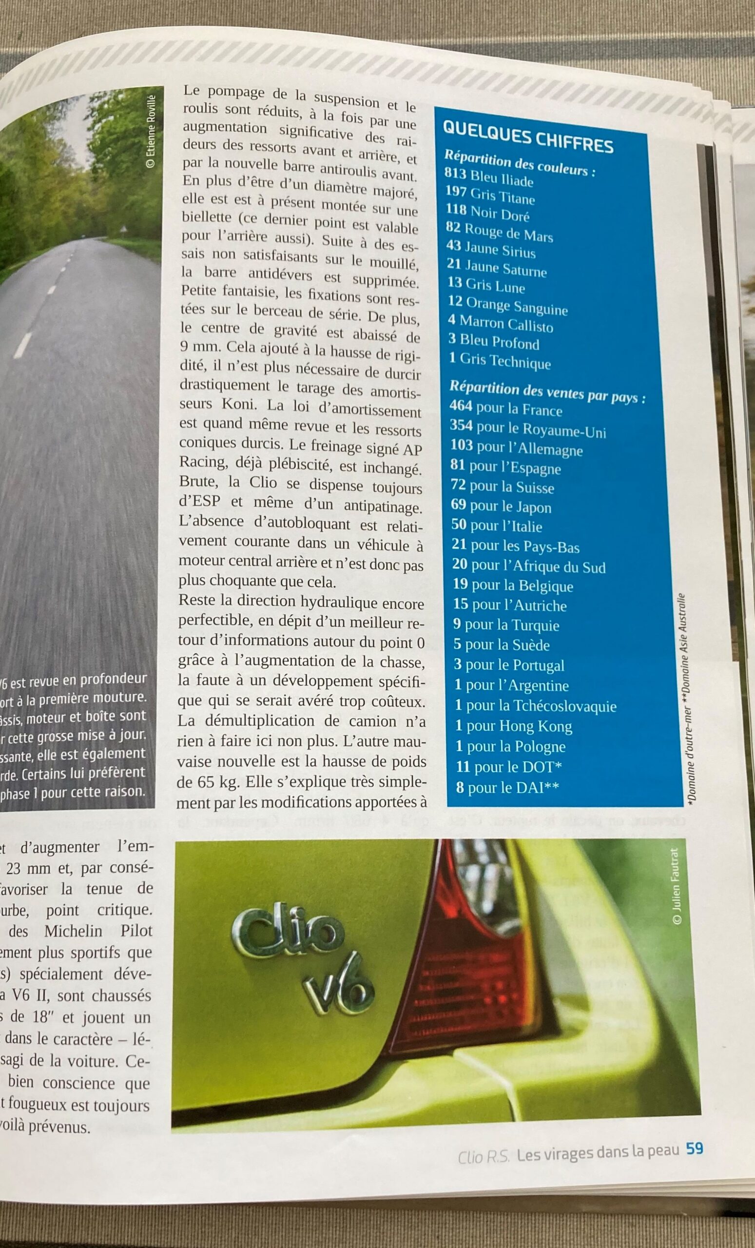 La CLIO V6, destinée 20 ans après la fameuse R5 Turbo, à promouvoir et à célébrer l’engagement de RENAULT en compétition, sera produite jusqu’en juillet 2005. Pour un total global phases 1 et 2 de moins de 3000 exemplaires …