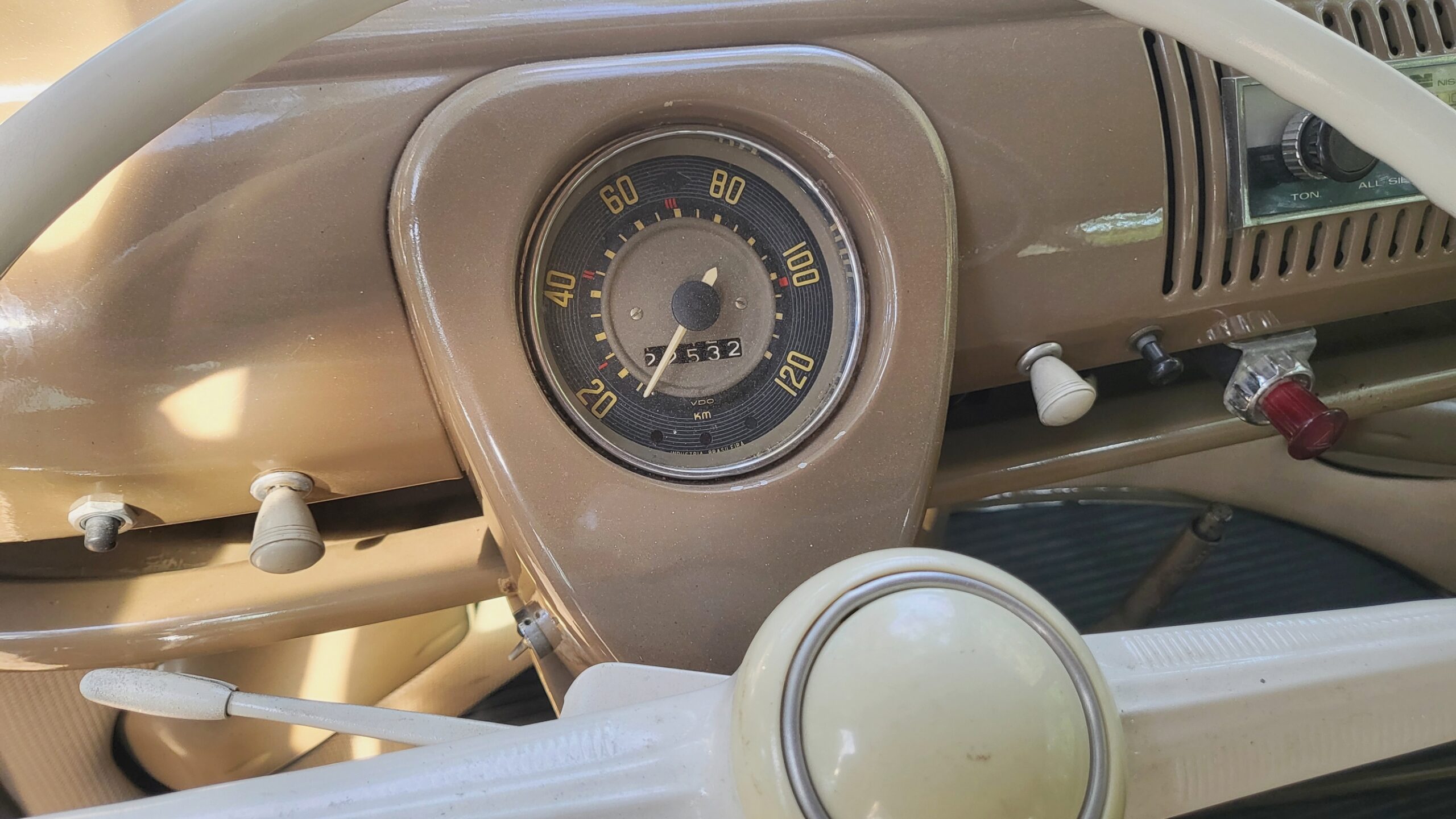 Intérieur : Simili cuir beige et blanc, volant Bakélite.