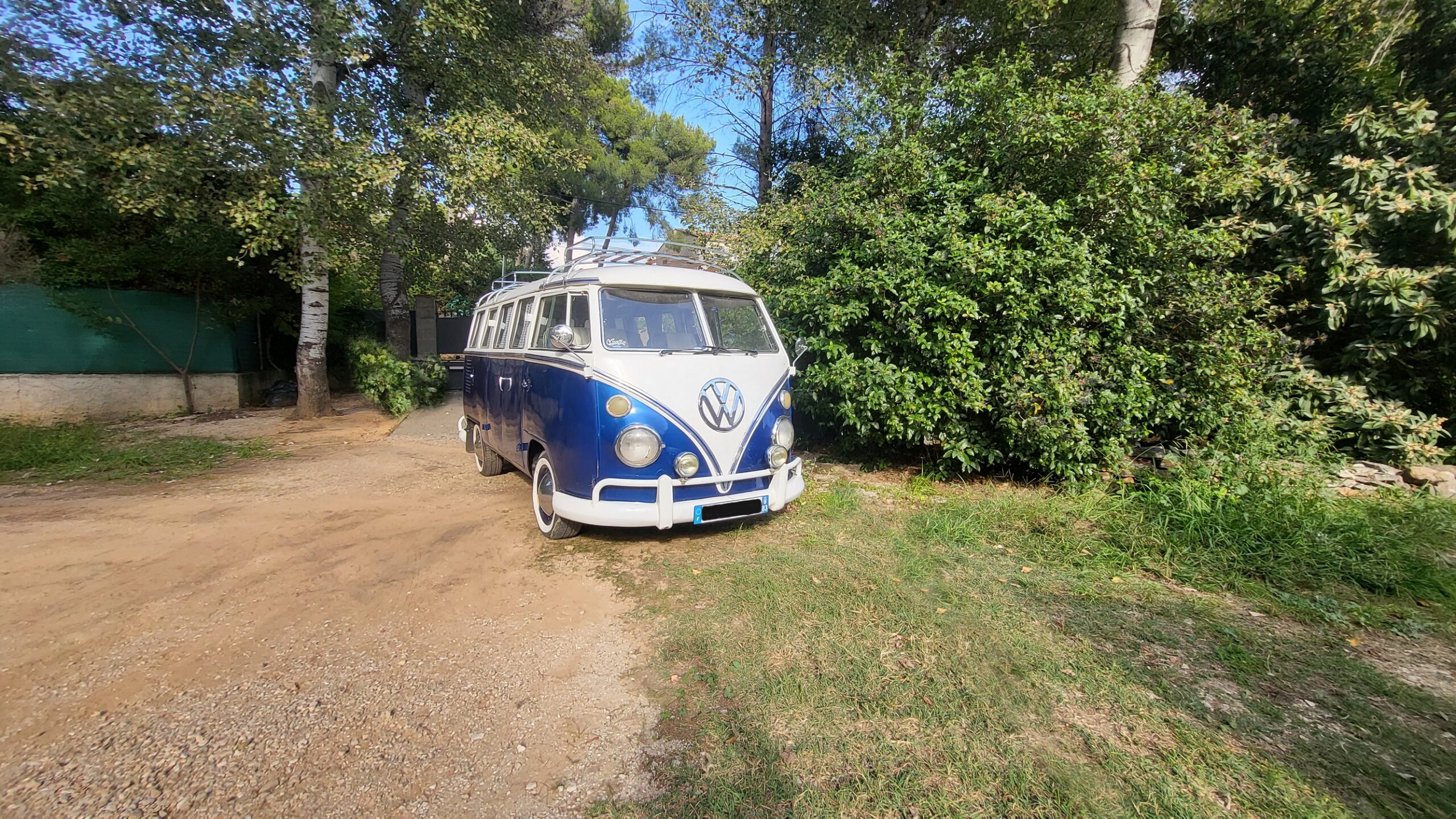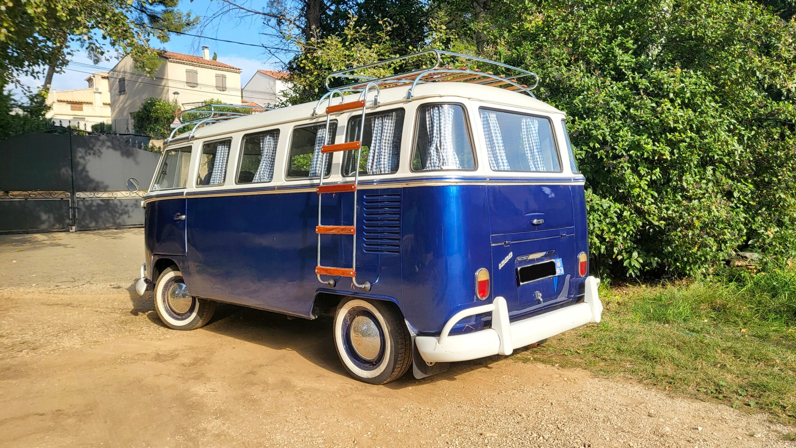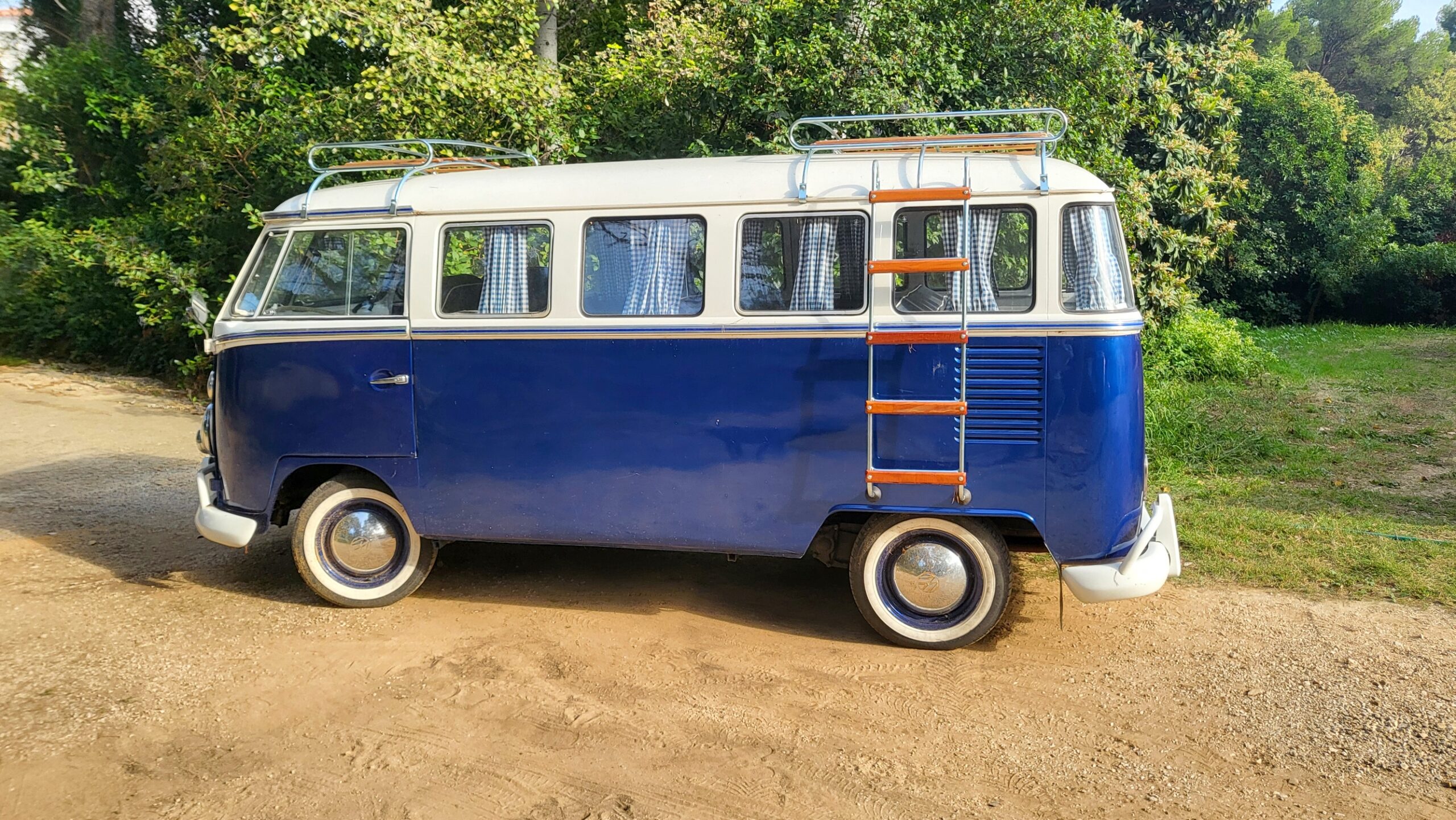 Ce VW T1 Kombi de 1973, reconnaissable à sa calandre et ses vitres avant Split Window, est l'icône de la liberté et du voyage.