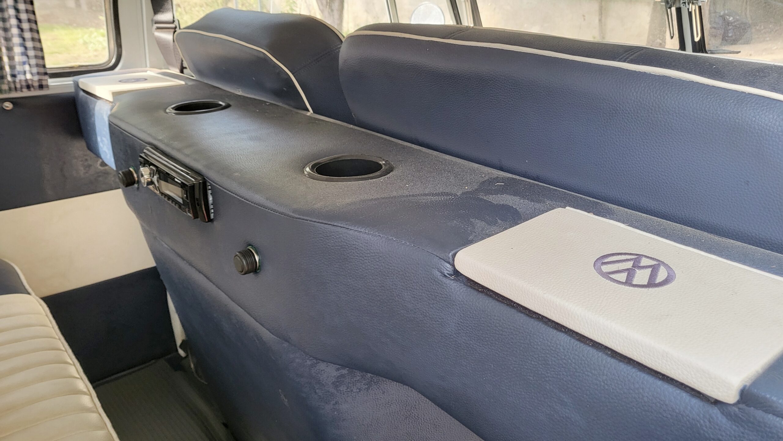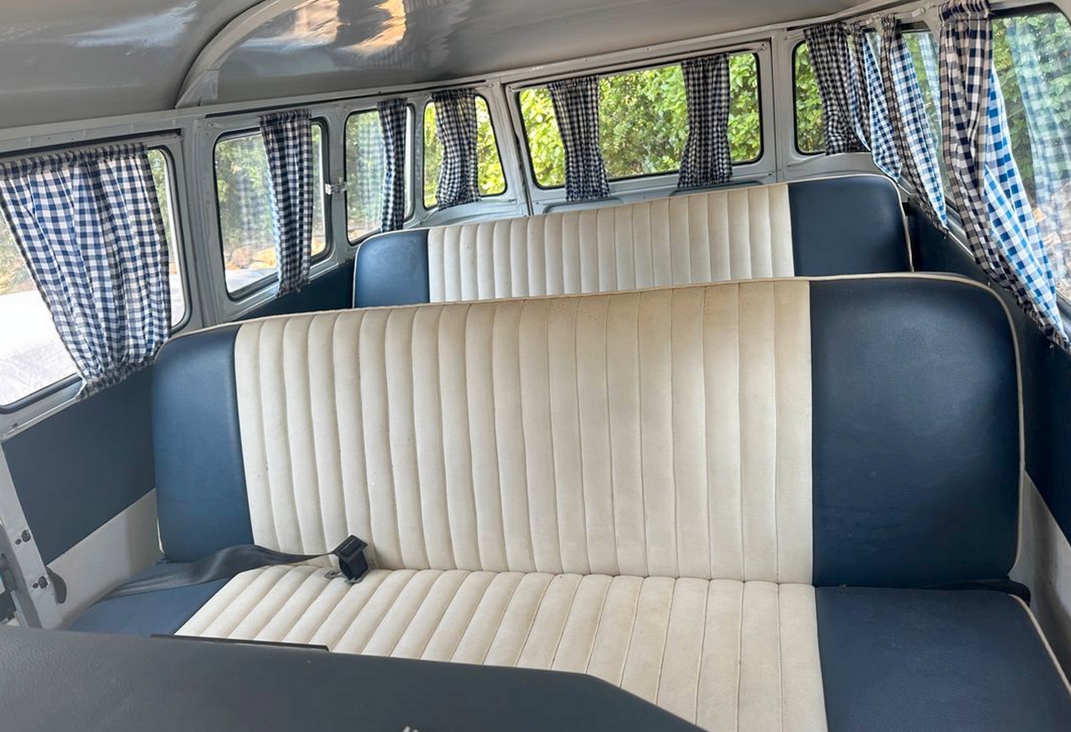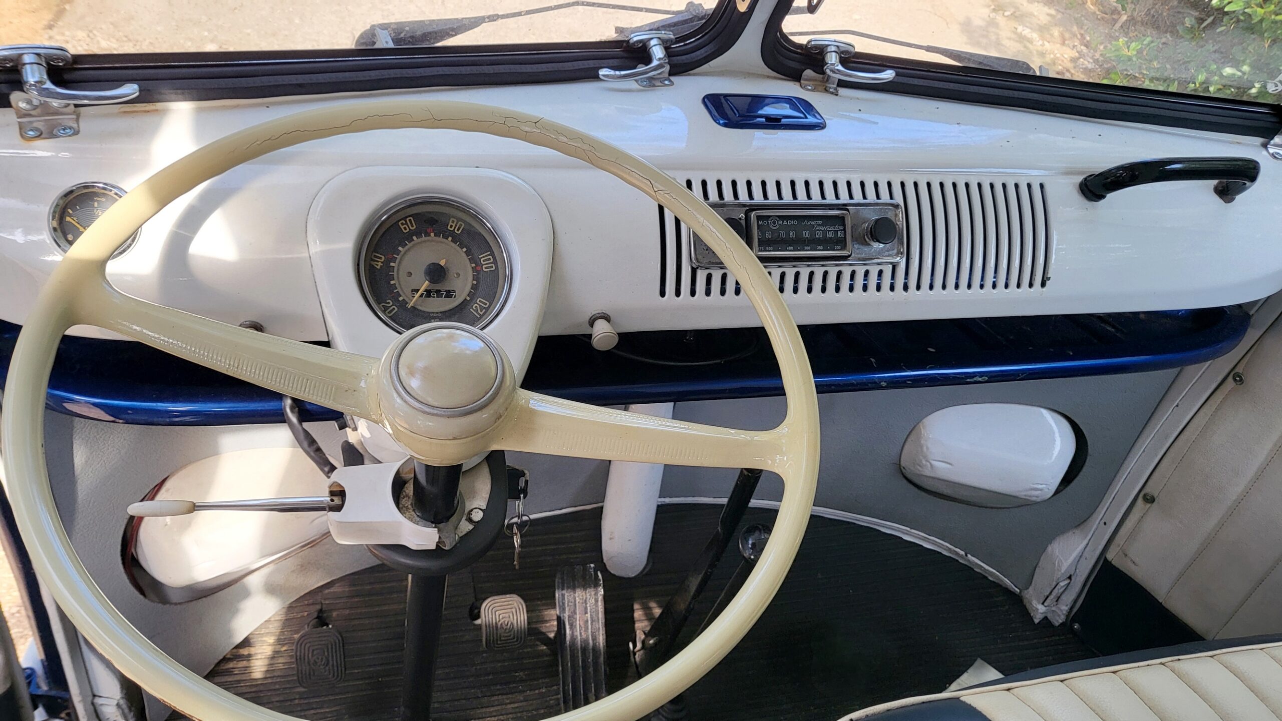 Intérieur : Simili cuir bleu et blanc, volant Bakélite, console avec rangements derrière les sièges passagers.